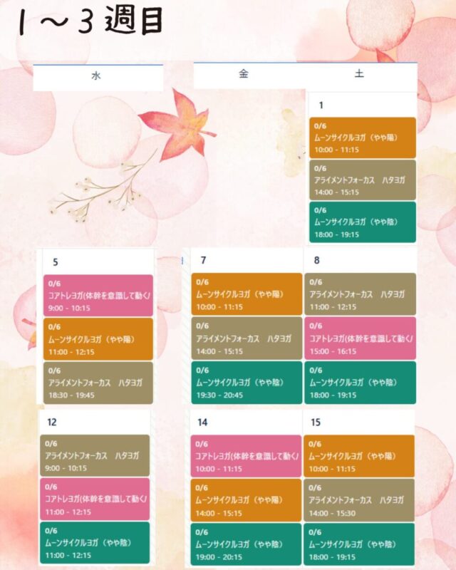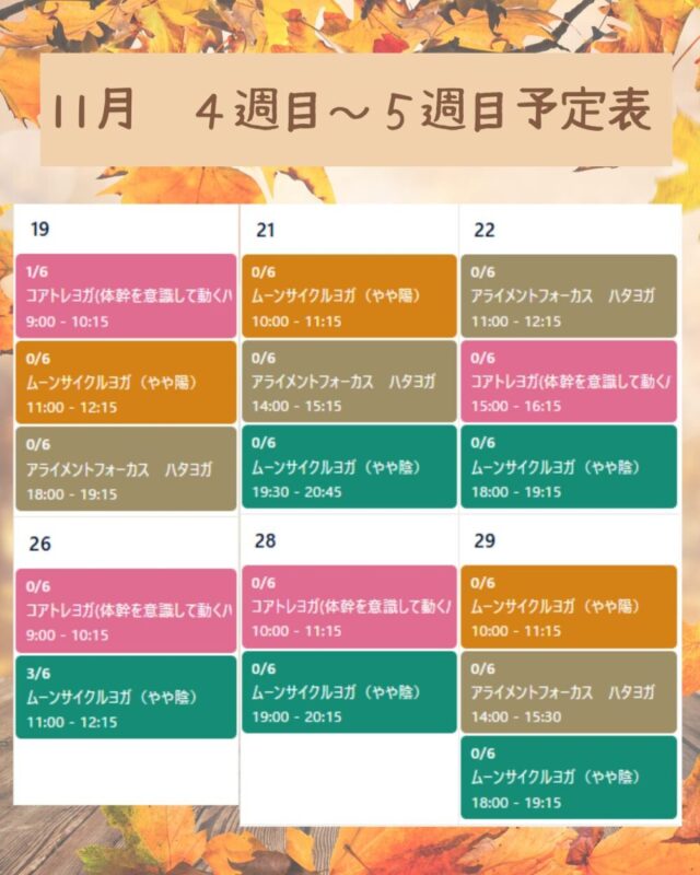 11月予定表 studio情報 2025.10.212025.11.11 11月のヨガ教室スケジュールができました🧘♀️✨朝晩の冷え込みが少しずつ増してきましたね。こんな季節こそ、体をほぐして巡りを良くし、心までぽかぽかにしていきましょう😊ご都合の合う日を見つけて、ぜひ一緒にヨガを楽しみましょう🌸